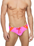 The best beach wear starts with bright colors, comfortably styling, and a colorful drink that may or may not involve rum. Start your sunny days the right way with this brilliant swim trunk that features a slice of Sunset hits, the sun rays glisten across the water, and you're lounging on the beach in the Calypso Swim Brief drinking a Bahama Mama. Tight-fitting for maximum hold, but stretchy enough for comfortability and movement. Drawstring at waist. Embellished with a BodyAware logo bar on left side of the swim brief.