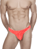 A perfect pair of thong underwear to put a little lift in your life and a whole lot of comfort down below. The Cuddle Up Thong features very soft and cuddly fabric printed with miniature polka dots in red and a sock monkey print in brown at the back. Expertly turned-over elastic at the waist and legs. Our thongs are tensioned just the right amount so that there is no tightness between the legs, only soft comfort. The Cuddle Up Thong features a contouring seam down the center of the pouch that is flat-locked for comfort and follows your manly shape perfectly. This allows a much-needed rest for your scrotum and penis with no tension, pinching or squeezing. Comfortable thong back.
